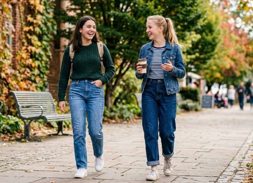 Jeans werden häufig im Alltag getragen, zum Beispiel in der Schule, in der Freizeit oder bei Ausflügen.